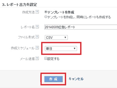 4. 「3.レポート出力を設定」の「作成スケジュール」で「毎日」を選択し、「作成」ボタンを押す