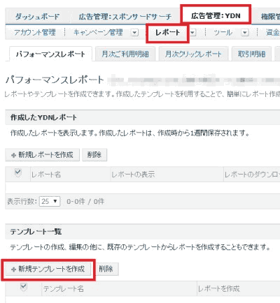 1. 「広告管理:YDN」タブ、「レポート」の順にクリックし、「新規テンプレートを作成」ボタンを押す