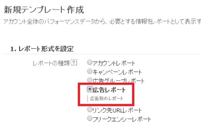 2. 「1. レポート形式を設定」の「レポートの種類」で「広告レポート」を選択