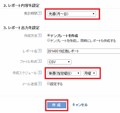 3. 「2.レポート内容を設定」で「先週(月~日)」、「3.レポート出力を設定」の「作成スケジュール」で「毎週(指定曜日)」「月曜」を選択し、「作成」ボタンを押す