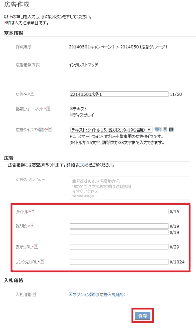 4. 広告作成画面で広告のタイトル、説明文、表示URL、リンク先URLを入力