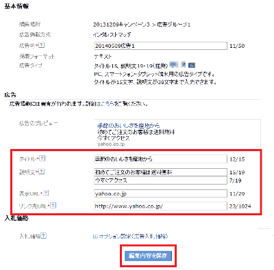 3. 広告のタイトル、説明文などを編集し、「編集内容を保存」ボタンを押します