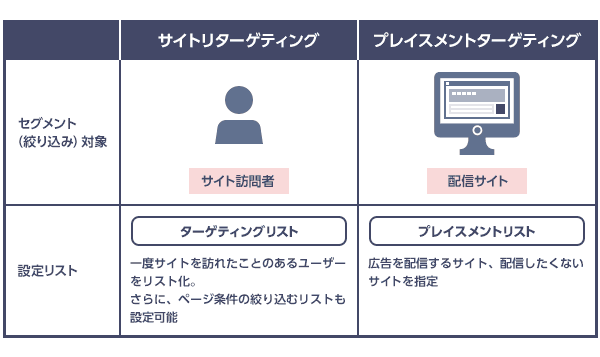 どちらもYDN広告ですが、指定できる箇所が異なります。サイトリターゲティングは「配信対象(ユーザー)」を指定し、プレイスメントターゲティングは「配信先(サイト)」を指定します。そのため、それぞれの機能を設定する際に作成するリストが異なるのです。