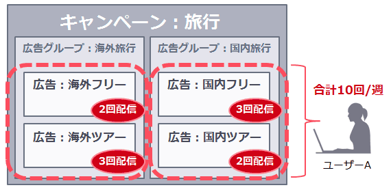 広告グループ単位で週5回のフリークエンシーキャップを設定した場合、各広告グループ配下のいずれかの広告が5回ずつ表示され、広告グループ全体で合計10回表示されます