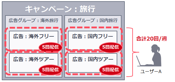 広告単位で週5回のフリークエンシーキャップを設定した場合、各広告が5回ずつ表示され、広告全体で合計20回表示されます。