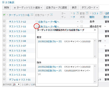 ターゲットリスト管理画面の一覧上で、「広告グループ」項目の吹き出しアイコンをクリックすると、ポップアップが立ち上がりそのターゲットリストが配信・除外設定されている広告グループがリストで参照できる。