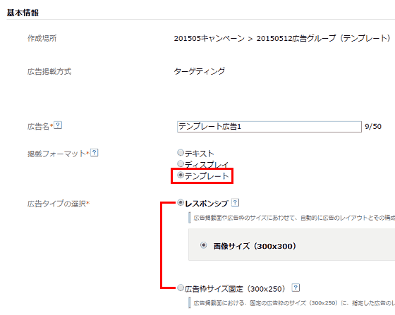 キャンペーンに続いて広告グループを作成したら、広告を作成する。基本情報の掲載フォーマットで「テンプレート」を選択すると、広告タイプの選択肢に「レスポンシブ」と「広告枠サイズ固定(300x250)」が表示される。